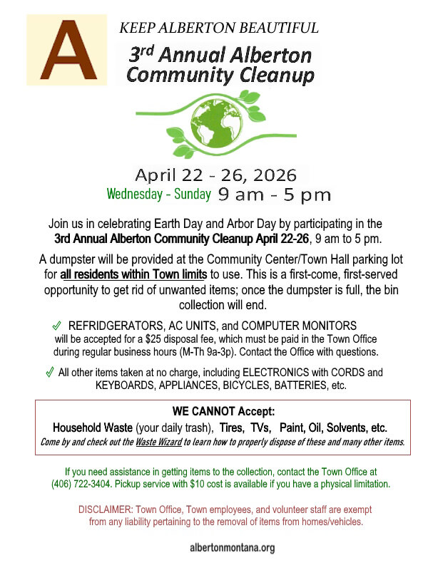 TOWN RESIDENTS ONLY can use the dumpster supplied by Town Office for 3rd Annual Community Cleanup. NO HOUSEHOLD GARBAGE ALLOWED. Also Town CANNOT accept TVs, tires, oils, paints and solvents. Disposal fee ($25) for computer monitors, A/C units and refridgerators. FREE disposal for appliances, batteries and more. Physical limitations? $10 pickup fee. See flyer for details. Qxs? Call 406 722-3404. @ Community Ctr Parking Lot.
